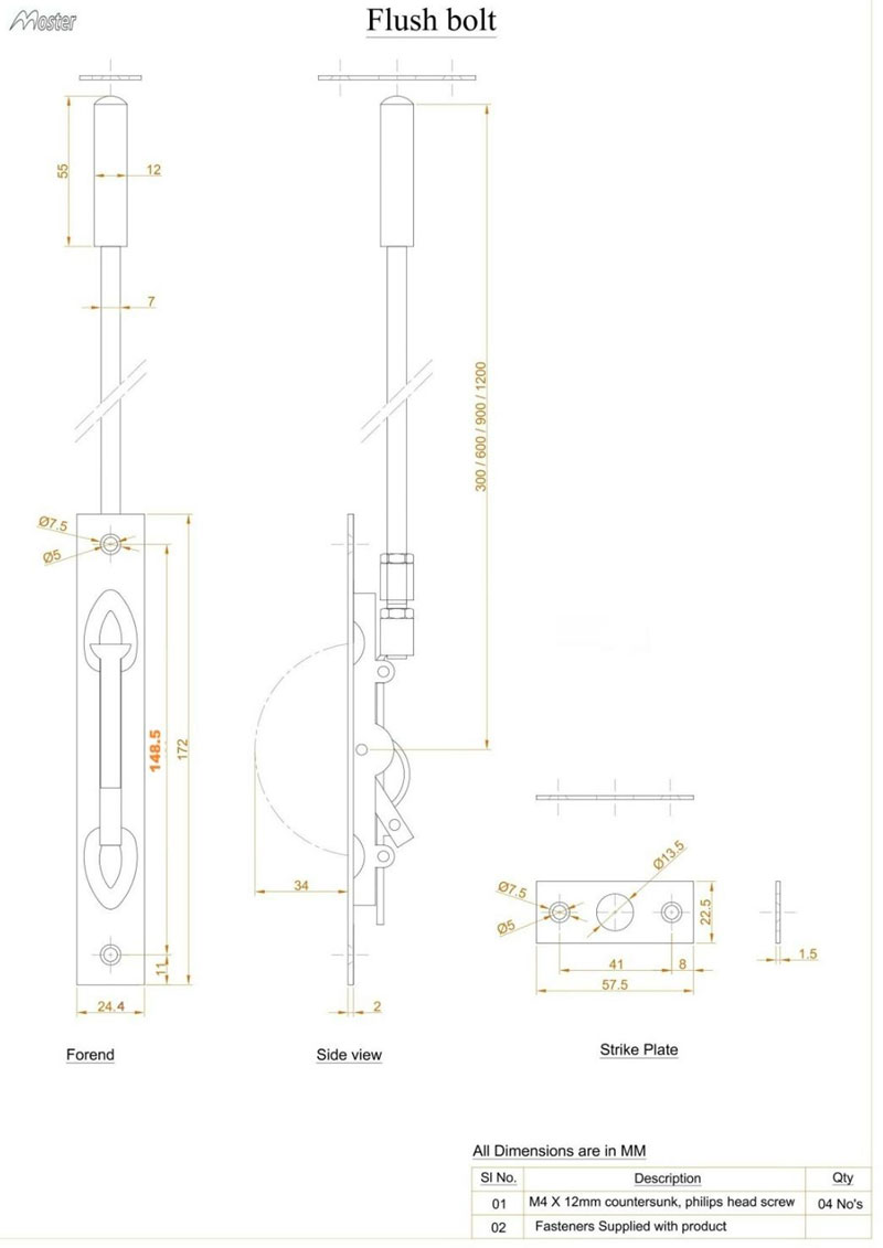 Moster, Concealed Flush Bolt is a high-quality door accessory made with durable stainless steel material. This product is available in different sizes to suit various door types and applications. The flush bolt is designed to be concealed and installed on the inside surface of the door, providing a sleek and elegant look. It is easy to install and operate, allowing for smooth and effortless opening and closing of doors. This flush bolt is an ideal choice for residential and commercial properties that require a secure and stylish door solution.